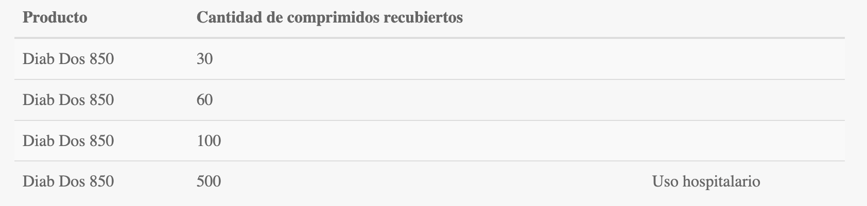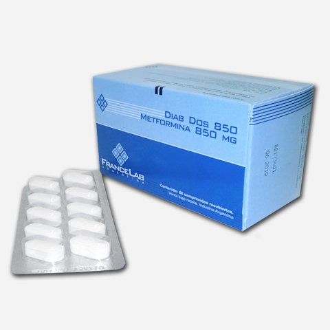 Merformina Clorhidrato 850 mg. Antihiperglucemiante oral. Asociado al régimen dietario, Diabetes no insulino-dependiente, que no presenta cetonuria, cuando la estricta aplicación del régimen no permite la normalización del peso y de la glucemia. En la complementación de la insulinoterapia en la diabetes tipo 1 y en la diabetes inestable, en diabetes insulino resistente. Baja la glucosa en personas diabéticas, pero no tiene efecto hipoglucemiantes en personas no diabéticas.